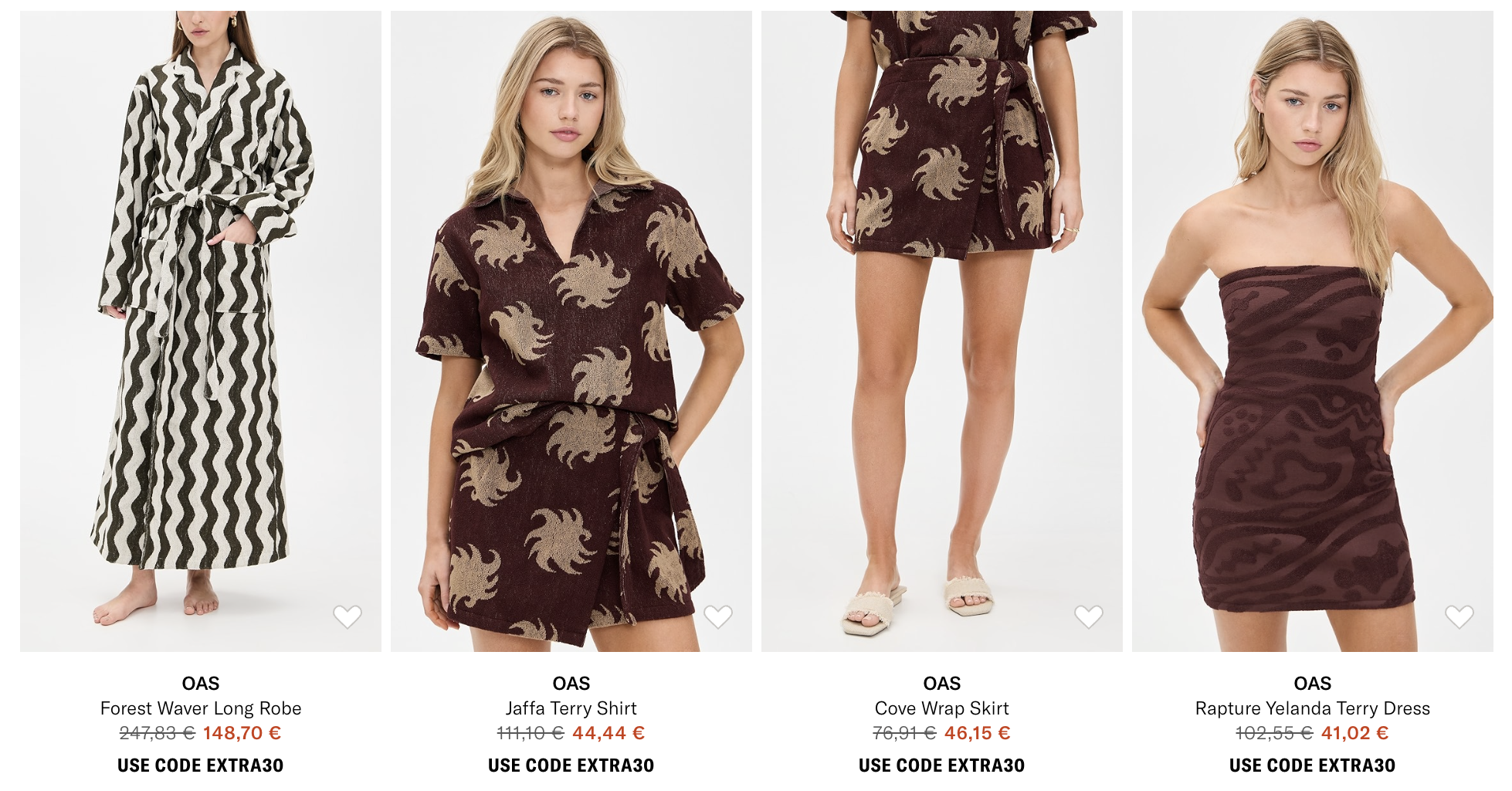 OAS ist eine Marke, die zum großen Teil über Prints funktioniert. Die Muster sind klar und grafisch, ein bisschen mediterran, aber ohne Strandmotiv-Kitsch. Die Farben sind so intensiv, dass sie sich nicht durch Sonne, Salz oder Wasser wegwaschen lassen. Und genau das macht etwas mit der Tragedauer. Wenn ein Teil visuell Bestand hat und man es auch nach mehreren Sommern noch gerne sieht, trägt man es automatisch länger – und das ist am Ende einer der ehrlichsten Wege zu nachhaltigem Konsum.